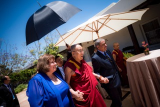 There is excitement everywhere the Dalai Lama goes. First of all, he is surrounded by people in saffron-colored robes or dark suits whose job it is to take care of his complete well-being, so when he walked into our courtyard, one of his monks followed close behind holding an umbrella over His Holiness to shield him from the sun.