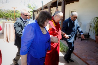 When he arrived, my husband and I were in the courtyard in the front of our house to greet him. We saw the cars arrive, we saw monks dressed in saffron-colored robes, we saw security people in dark suits plus some of our own staff…but we didn’t see the Dalai Lama: he had wandered from his delegation to go chat with the rather surprised valets.