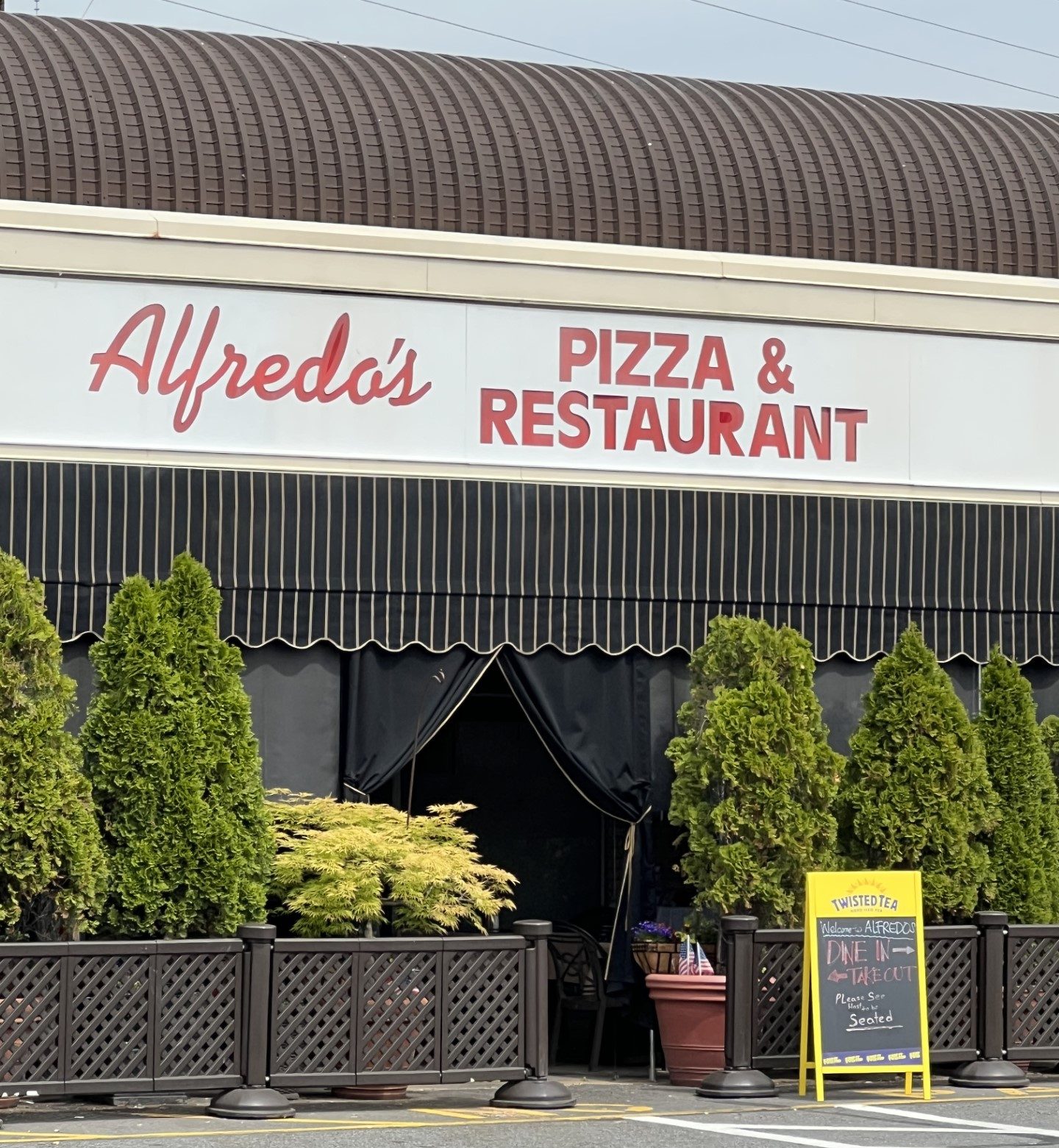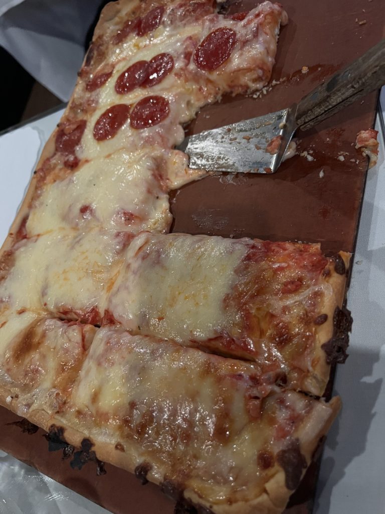 Alfredo’s, our waitress tells us, serves Old Forge Pizza and you have to order it by the tray. Old Forge pizza is rectangular and is made on a rectangular metal tray. It has a light, crispy crust that’s soft and fluffy in the middle. It’s topped with a combination of cheeses, including American cheese, as well as the usual pizza toppings. We are all-in to try it, so we order a tray. (A medium amount of good pizza, not all-you-can-eat of pretty good pizza).